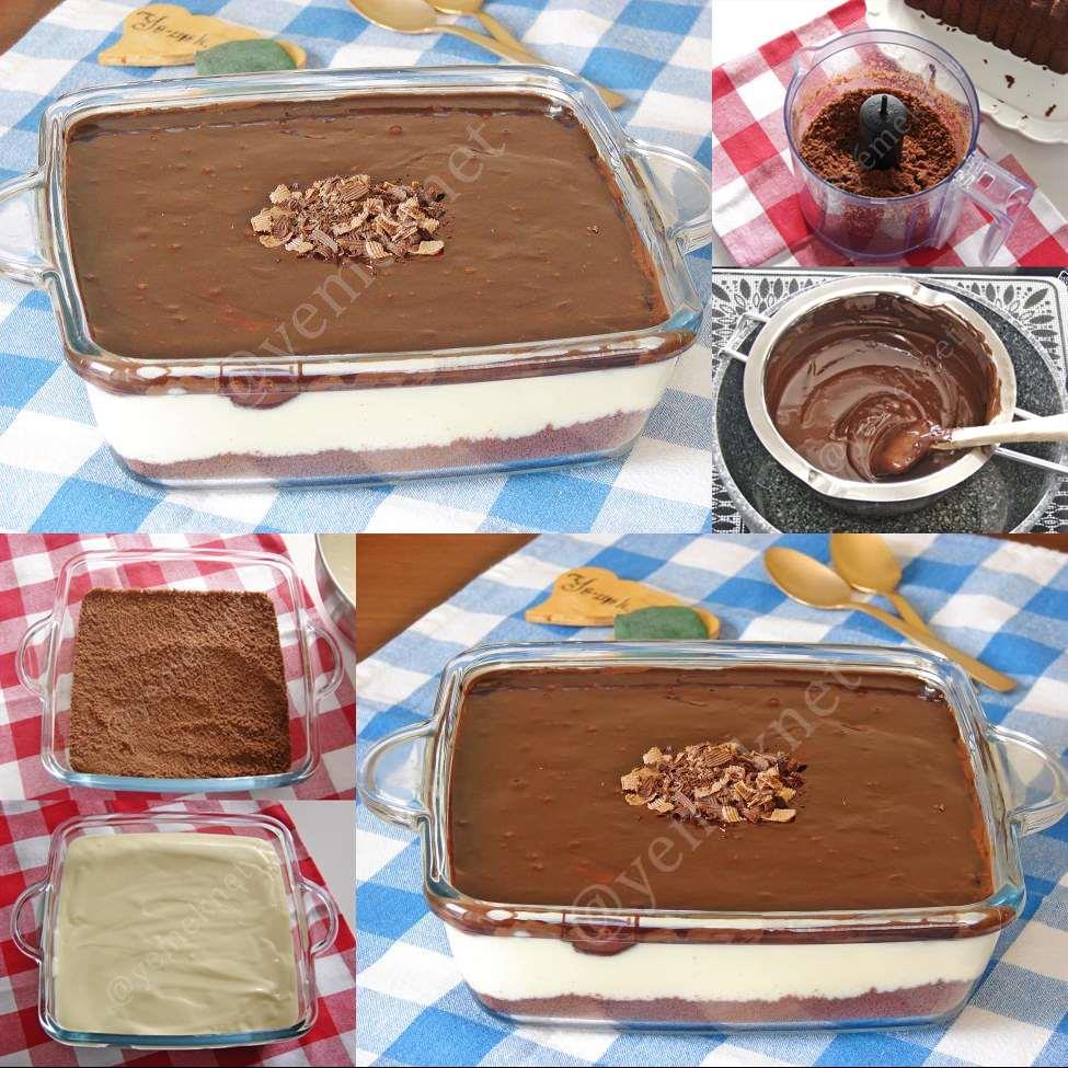 Robottan geçirdiğiniz kakaolu kek kırıntısını isteğiniz boyutlardaki kaplara eşit olarak paylaştırın. Biz tarifte büyük boy bir kap kullandık. Siz isteğe göre porsiyonluk kaplarda da yapabilirsiniz. Kek kırıntısının üzerine hazırladığınız kremayı döküp, eşit bir şekilde yayın. Son olarak kremanın üzerine servise yakın benmari usulü erittiğiniz çikolatayı döküp, eşit bir şekilde yayın.